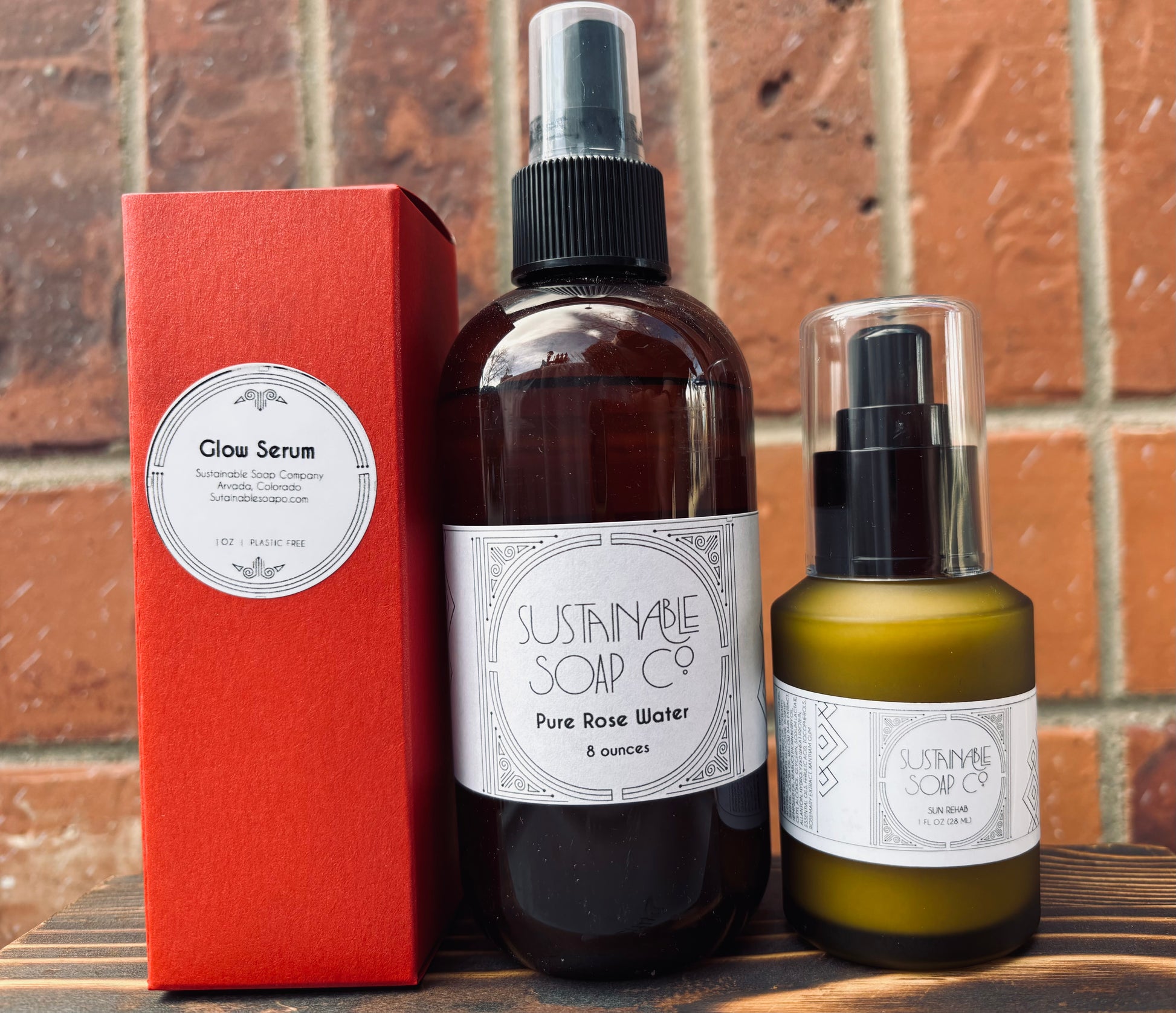 8 ounces Rose water, Glow serum, and 2 ounces Sun Rehab